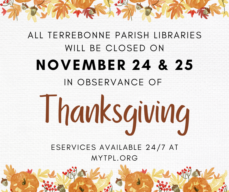 All Terrebonne Parish Libraries will be closed Nov. 24 & 25 in observance of Thanksgiving. Dularge Branch will be closed from Nov. 21-25 for repairs.eServices available 24/7 at mytpl.org.